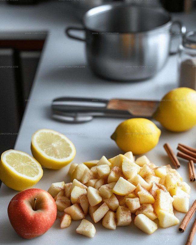 Grab 4 cups of Granny Smith and Pink Lady apples. Peel and dice them into small, uniform pieces. Drop the apple chunks into a measuring cup and cover with water to prevent browning.