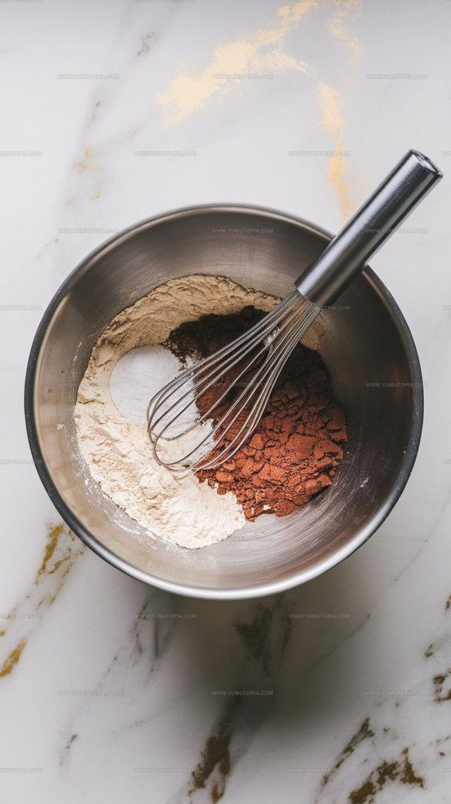 - Sift together 2 cups flour, ½ cup cocoa powder, 1 tbsp instant espresso powder, ½ tsp salt, and ½ tsp baking powder in a separate bowl.
