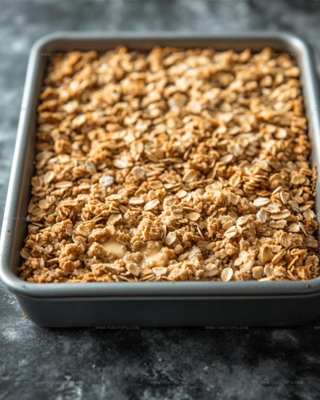 Press about half the crumb mixture firmly into the prepared pan, creating a solid bottom layer. Slide the pan into the 350°F oven and bake for 12-15 minutes until it turns a soft golden color. Let it cool for a few minutes.