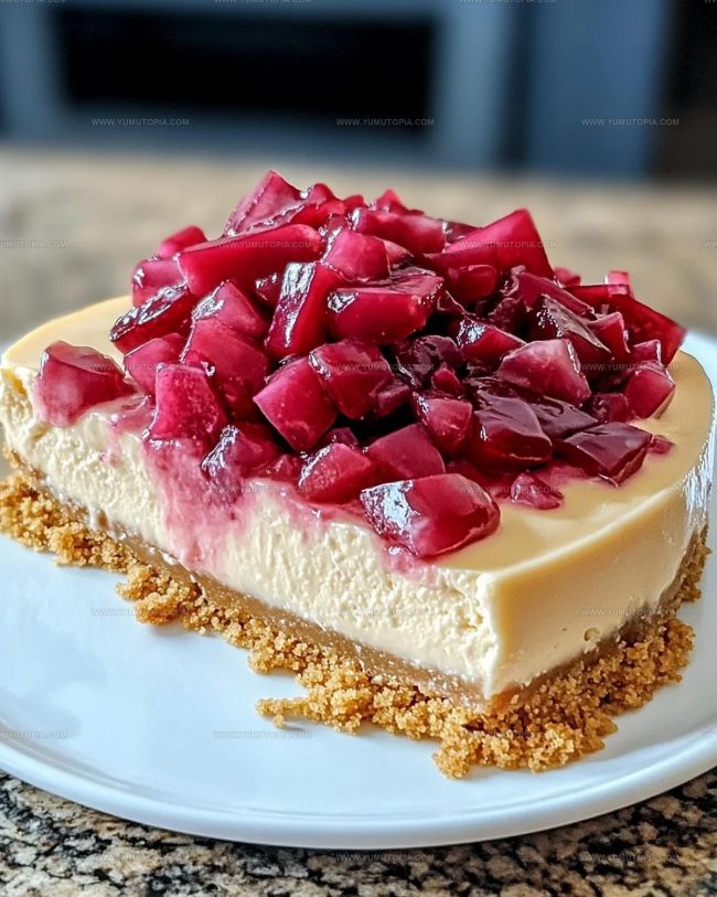 Rhubarb Cheesecake delivers a creamy, tangy dessert that will make your taste buds dance with pure delight. Fresh rhubarb combines with rich cream cheese to create a perfect balance of sweet and tart in each delectable slice.
