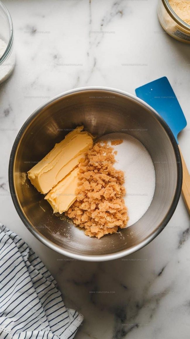 - Cream ¾ cup softened butter with 1 cup brown sugar and ½ cup granulated sugar in a separate large bowl. Beat until the mixture becomes pale and fluffy.