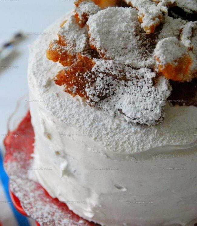 - Chill the cake before adding funnel cake topping to help frosting set and prevent sliding.