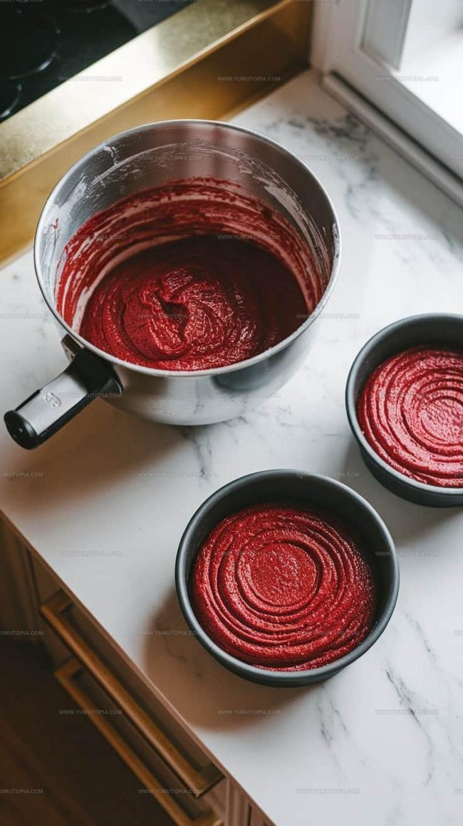 Divide the red batter evenly between the prepared pans. Bake for 25-30 minutes until a toothpick comes out clean. Allow the cakes to cool completely. Trim the tops if needed to create flat layers.