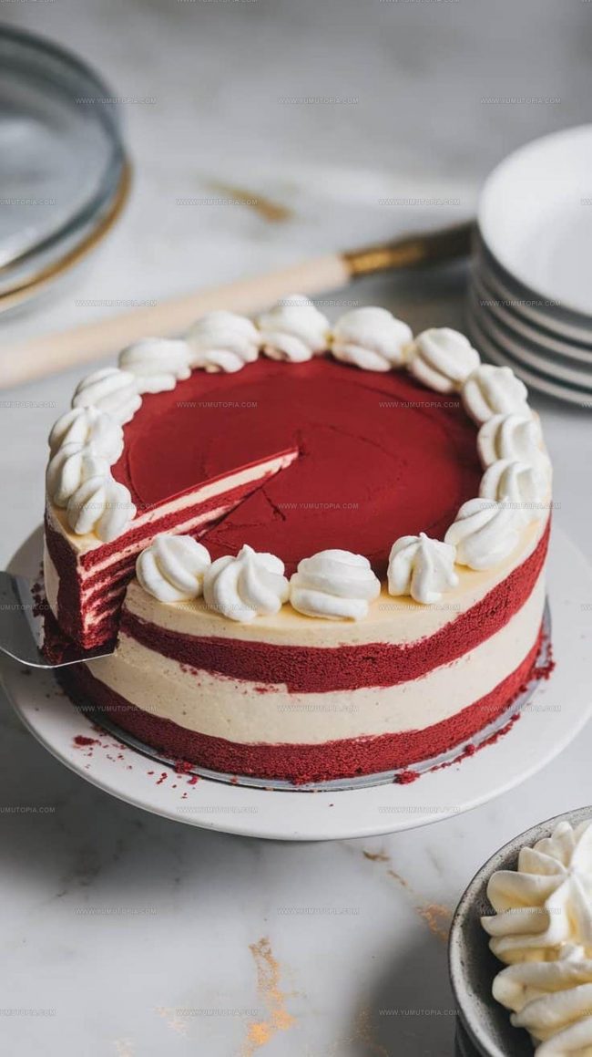 Whip 2 cups heavy whipping cream until it forms soft peaks. Spread the cream over the entire cake. Sprinkle some crumbled red velvet cake pieces on top for a decorative touch.