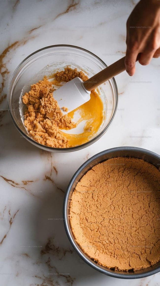- Press the crumb mixture firmly into a greased 9-inch springform pan, creating an even bottom layer.