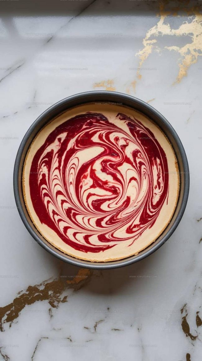 Pour the cheesecake filling into the cooled crust. Drizzle raspberry sauce across the top and use a toothpick to create beautiful swirls throughout the surface.