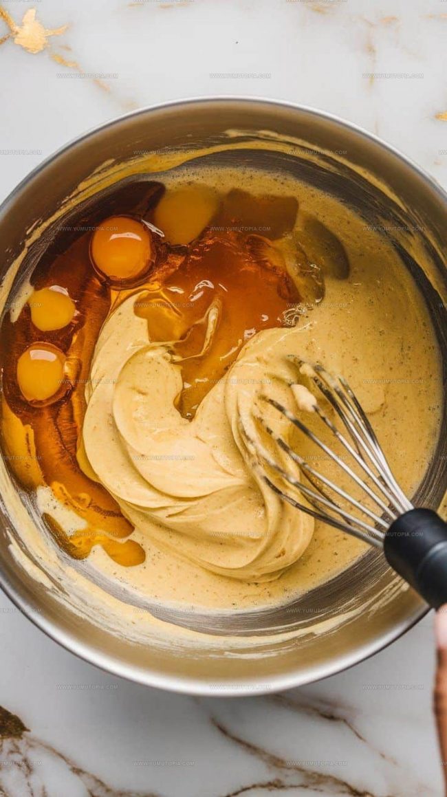 - Pour ½ cup honey, ½ cup melted unsalted butter, 2 eggs, and 1 tbsp vanilla extract into the mashed bananas. Whisk until the mixture looks smooth and uniform.