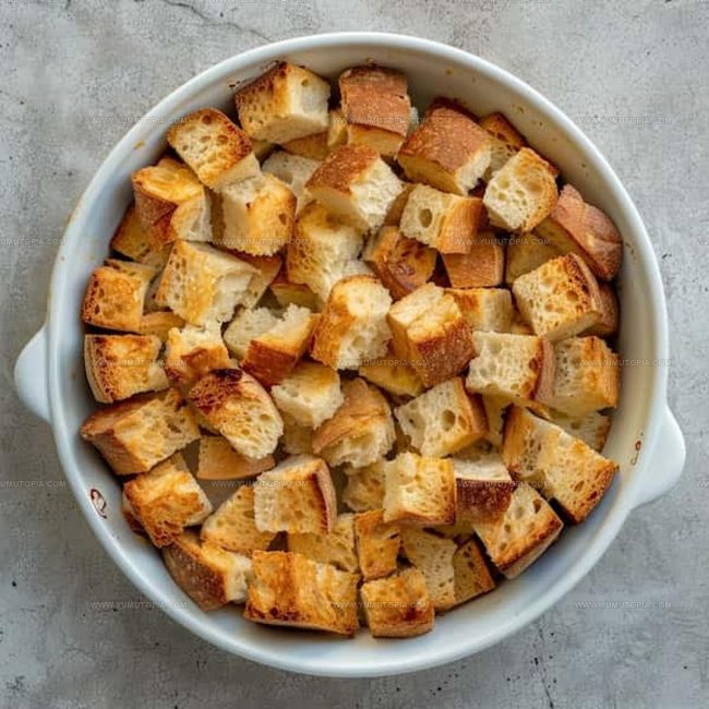 Preheat the oven to 350°F. Grab a 9×13-inch baking dish and lightly coat it with butter. Spread 4 cups of cubed stale bread across the bottom of the dish. If adding extra goodies, sprinkle 1/2 cup of raisins or chopped nuts over the bread so they’re evenly distributed.