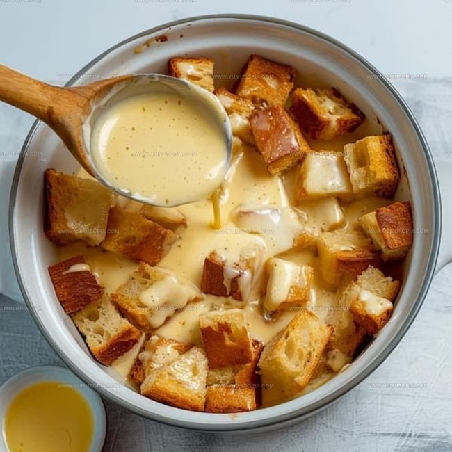 Pour the entire custard mixture over the bread cubes. Use a spoon to gently press down, helping the bread soak up all that delicious liquid. Let the dish sit for 15 minutes so the bread can absorb the flavors.