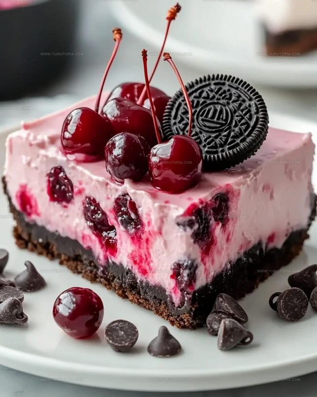 - Decorate the top with whole cherries and optionally sprinkle additional crushed Oreo cookies or chocolate chips.