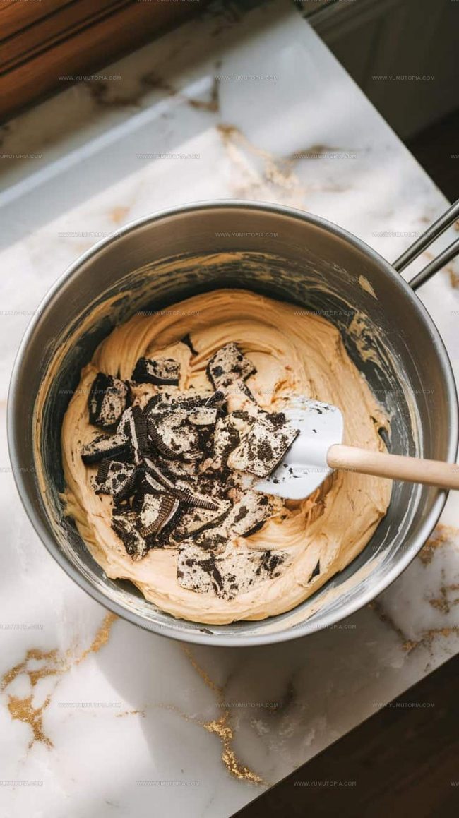 - Incorporate ½ cup sour cream and 1 tsp vanilla extract into the cream cheese mixture. Fold in 10 chopped Oreo cookies gently.