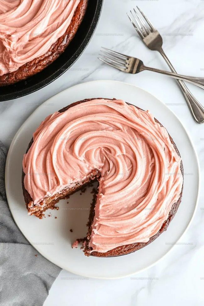 - Drizzle the pink icing evenly across the warm cake, allowing it to seep into the surface and create beautiful, glossy patterns.