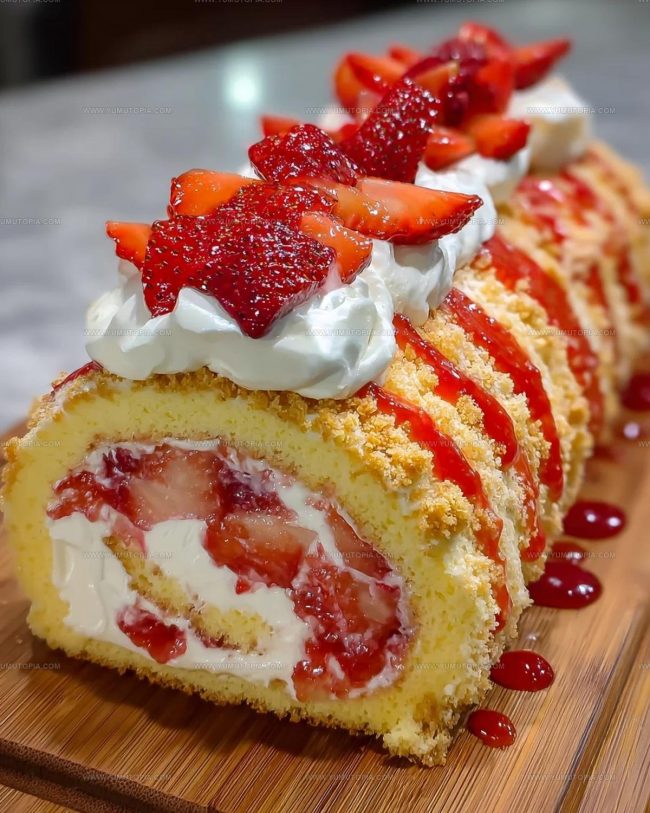 Coat the chilled roll with a thin layer of extra cheesecake filling. Sprinkle the strawberry shortcake crumble on top. Add fresh sliced strawberries, a drizzle of strawberry sauce, and a dollop of whipped cream.
