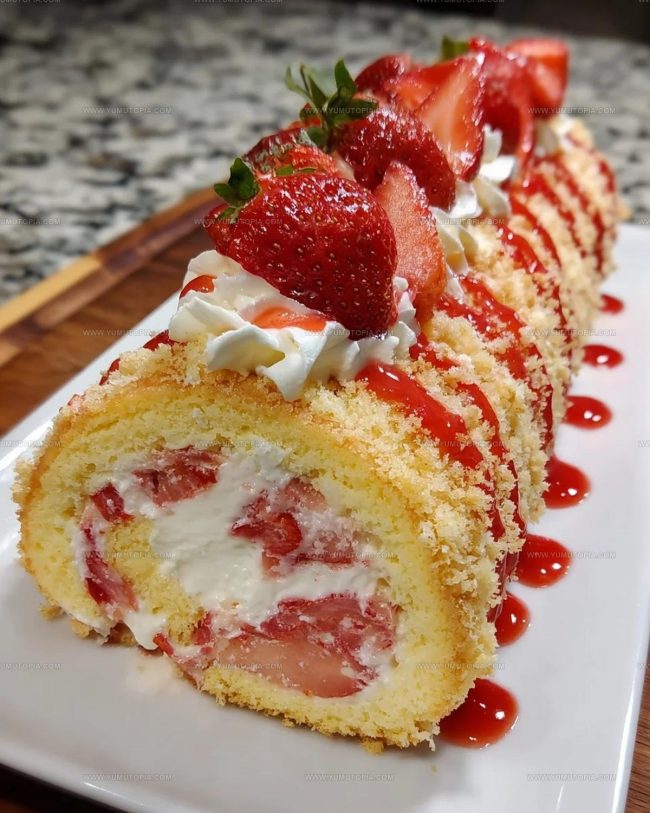 Cut into beautiful slices and serve chilled. Your strawberry shortcake cheesecake roll is ready to impress!